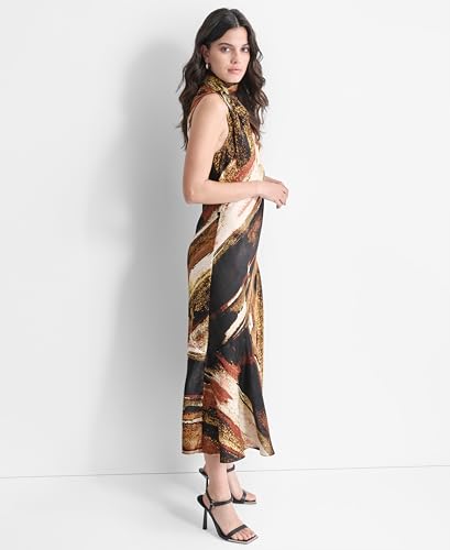 La robe à enfiler DKNY en satin sans manches avec col en cravate est une pièce captivante et élégante qui combine des couleurs vives avec une silhouette moderne, parfaite pour faire une déclaration en toute occasion. Cette robe à longueur cheville dispose d’un imprimé unique caractérisé par un motif tourbillon d’encre explosif qui crée un effet visuel dynamique et artistique.